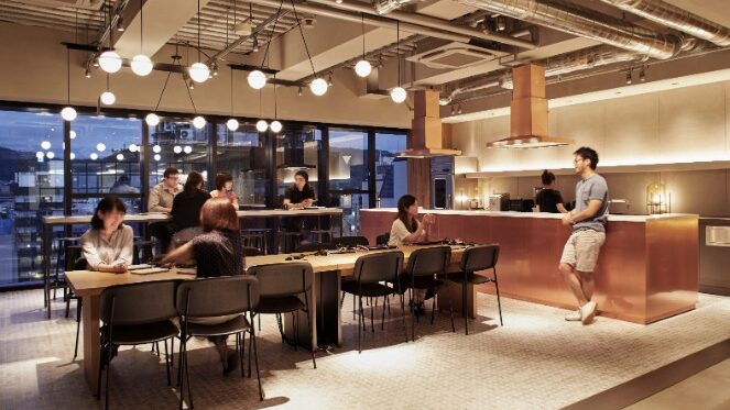 ワークスペース、ラウンジスペース、キッチンスペースの3つがあり、機能的でありつつスタイリッシュで開放的な空間デザインが大きな特徴です。