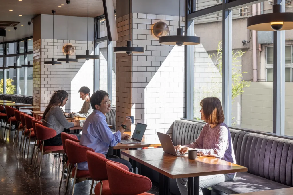 スペースには高速Wi-Fi、心地よいシーティングエリアとBGM、電源が備わっております。自然光が差し込むこの空間はポジティブな思考とひらめきを生み出します。