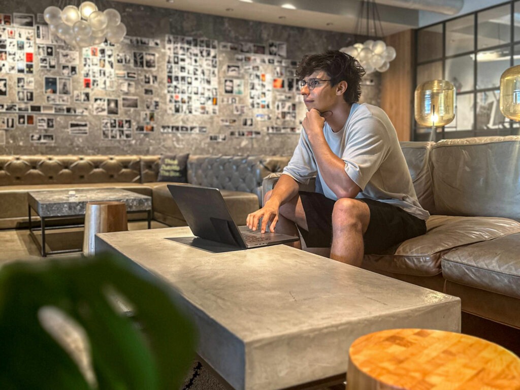 An open space is nice and I also liked the fact that it was like mixed with a hostel. It seems to have good diversity I can connect more with people. There is people coming in and out, so you can just potentially have more conversation with them as well. Also the internet speed was very good and the phone booths are really good too.