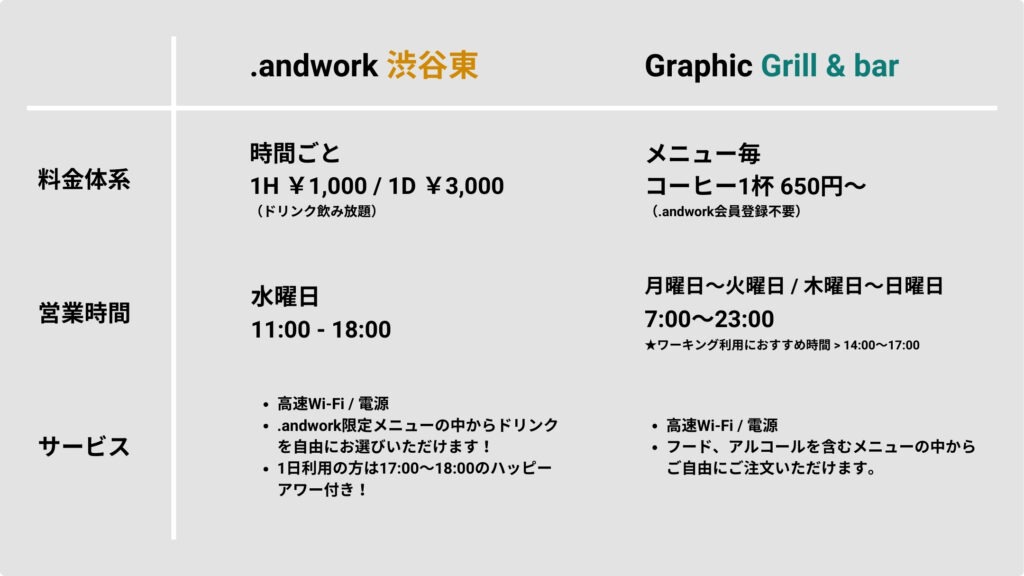 月曜日から火曜日、木曜日から日曜日はカフェ(Graphic Grill & bar)として、水曜日はコワーキングスペース(.andwork 渋谷東)としてワーキング利用いただけます。